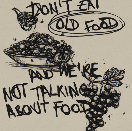 BEIGE T-SHIRT: FOOD AND PHRASE DESIGN IN PREMIUM ORGANIC COTTON