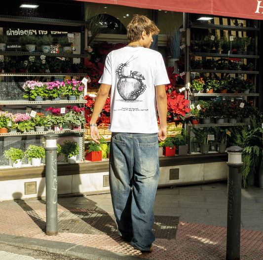 WHITE T-SHIRT: APPLE AND CENTIPEDE DESIGN IN PREMIUM ORGANIC COTTON